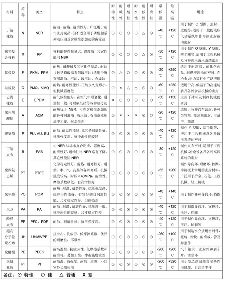 | 聚氨酯 | 通用石油基液压油,水乙二醇液压油, 油—水乳化型液压油 | -35至+100 | ≤1m/s | 315bar | 95°(SHA) |